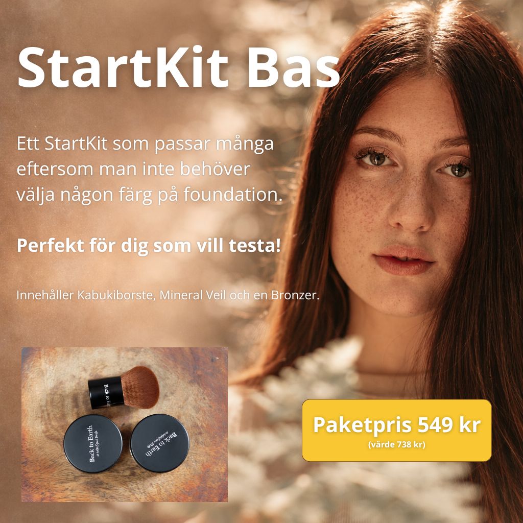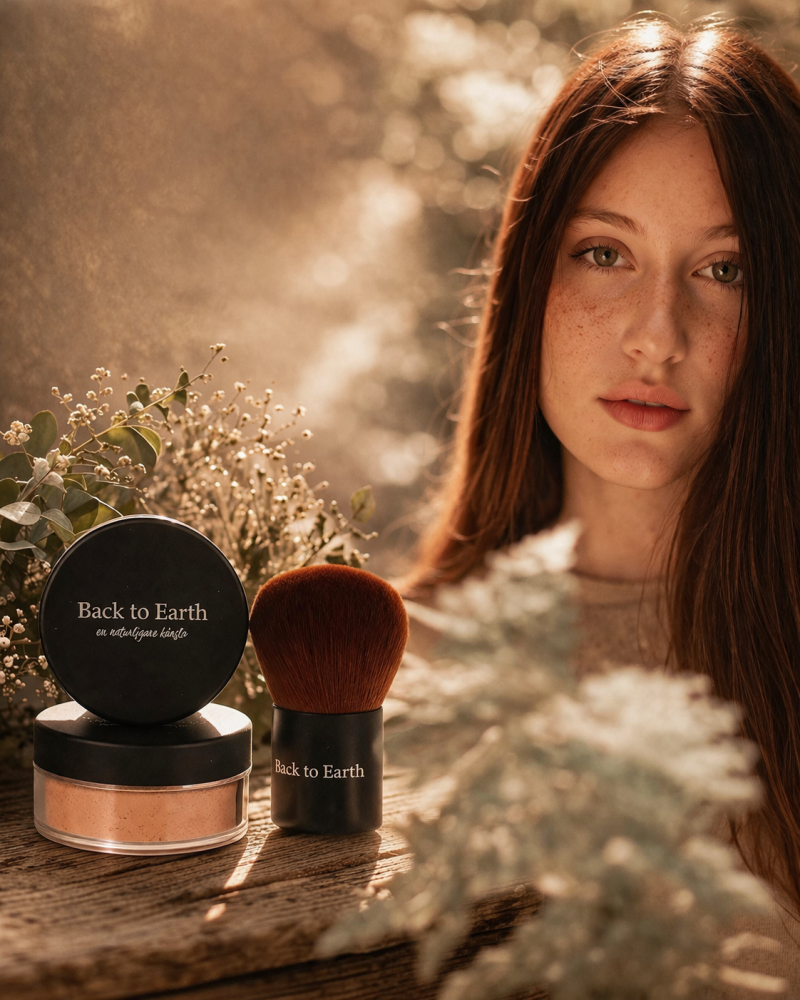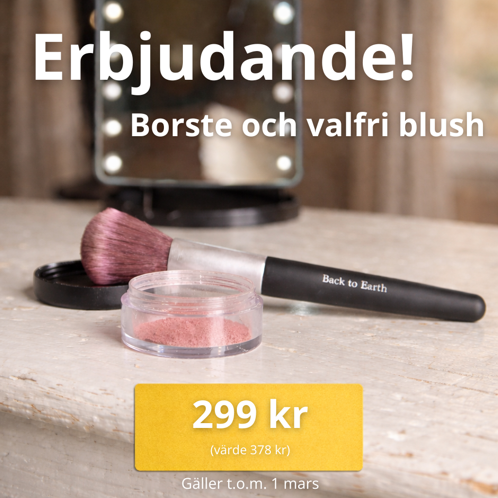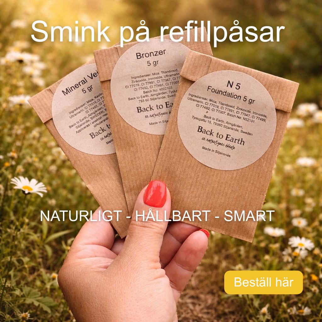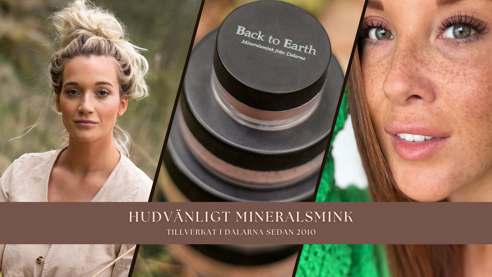 Här i hjärtat av Dalarna tillverkar vi ett mineralpuder med så få ingredienser som möjligt, det innebär att det är skonsamt mot din hud. Vi erbjuder ett smink som inte täpper till porerna utan låter de andas, du känner dig fräsch och naturlig, även med smink - det är en härlig känsla! Sminket är alltså svensktillverkat och bra för känslig hy, även om du har acne eller andra hudbesvär som t.ex Rosacea. Ett hudvänligt smink som dessutom är veganvänligt och ej testat på djur. Vi erbjuder även sminket i refillpåsar av återvinningsbar papp. Det betyder att du inte behöver slänga din burk bara för att sminket är slut, utan du kan fylla på den igen, och igen.....Vi erbjuder prover och färdiga Prova-På-Kit så att du kan testa först innan du köper dina burkar! Läs mer om Back to Earth här!