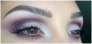 Bilden: skuggor som använts på ögonlocken är Purple Rain, och Misty Pink. Under ögat har Bordeaux använts (applicerad med fuktig pensel).