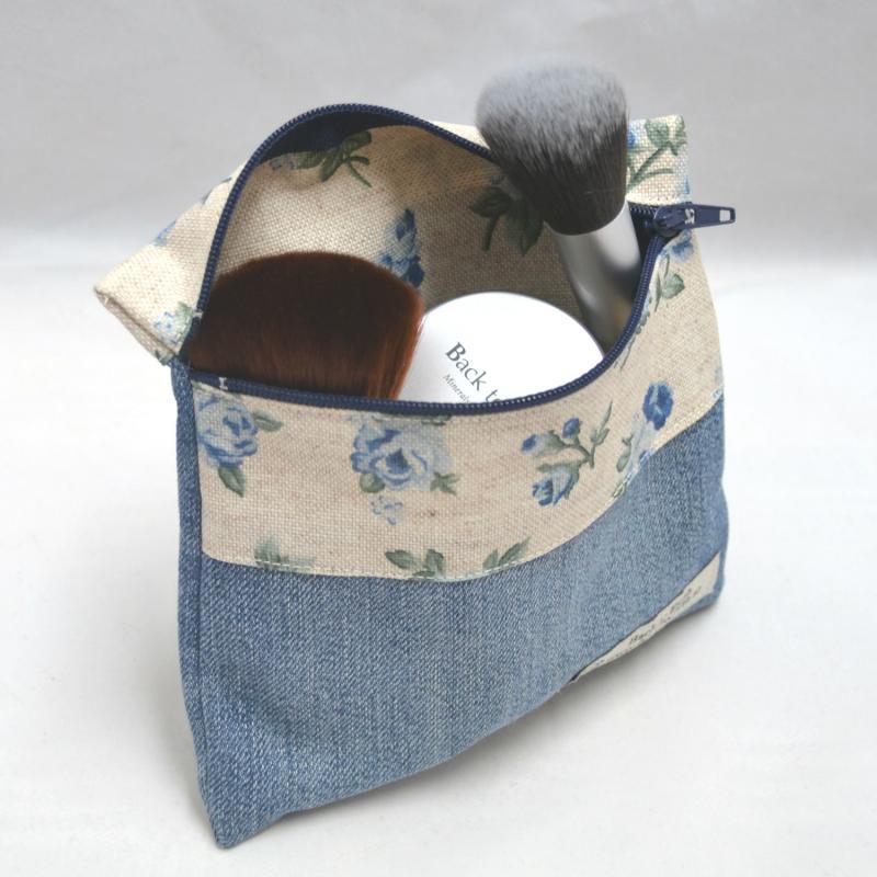 Den blå färgen kan variera eftersom den är sydd av återvunna jeans (ljusblå/mörkblå). Egen designad platt mindre sminkväska, tillverkad lokalt.